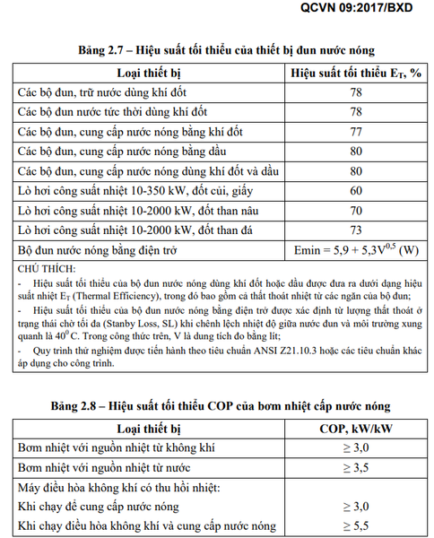 Ở Việt Nam, theo Quy định trong QCVN 09:2017/BXD Quy chuẩn kỹ thuật quốc gia về các công trình năng lượng hiệu quả thì hiệu suất tối thiể của các thiết bị đun nước nóng thể hiện trong bảng sau: